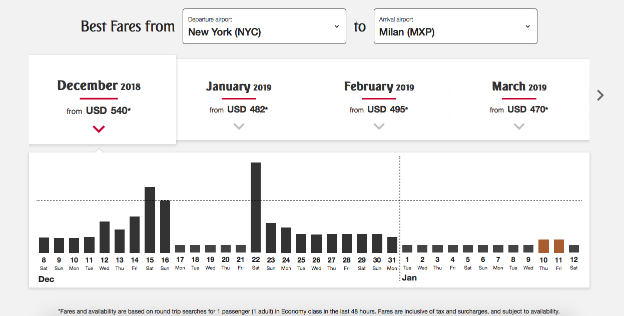 You are able to use the Best Fare Finder to find the lowest price for economy flights to over 150 worldwide destinations. To start your search, simply select your preferred departure and arrival airport (e.g. New York to Milan) from the dropdown menu and a calendar view will appear. The user-friendly tool allows you to search 4 months at a time so there is no reason you should be overpaying.