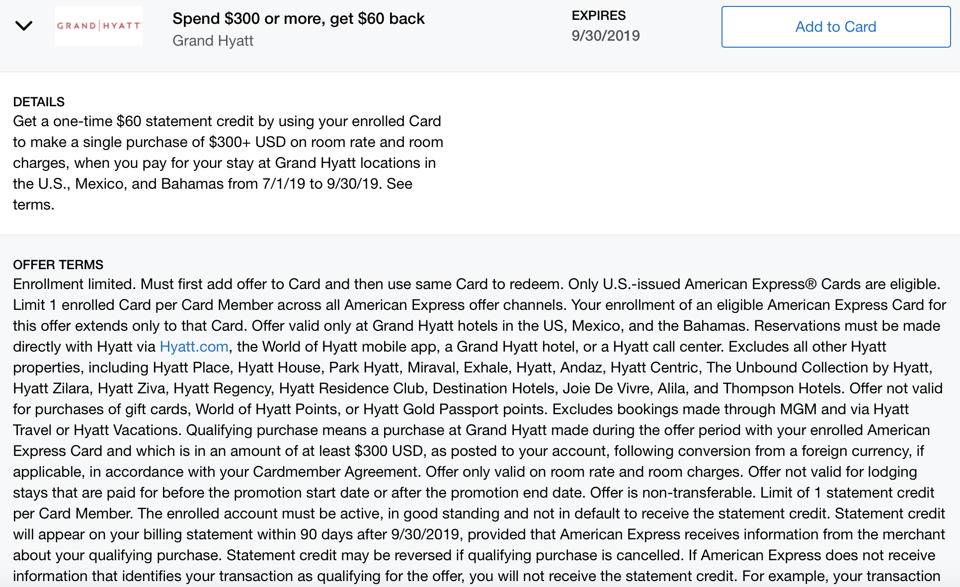 Currently, there’s a new targeted Amex Offer for $60 back when you spend $300+ at a Grand Hyatt property in the US, Mexico, and the Bahamas. The offer is valid for stays through September 30, 2019.