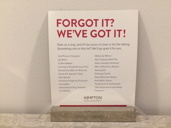 Kimpton, periodically, runs a fun promotion that can unlock a free gift at check-in just by saying a particular phrase known as a “Secret Password.” Saying the “password” at check in during my past stays have resulted in rewards like comped parking, room upgrades, and breakfast vouchers. Secretly, I was hoping that parking would be omitted from my bill.