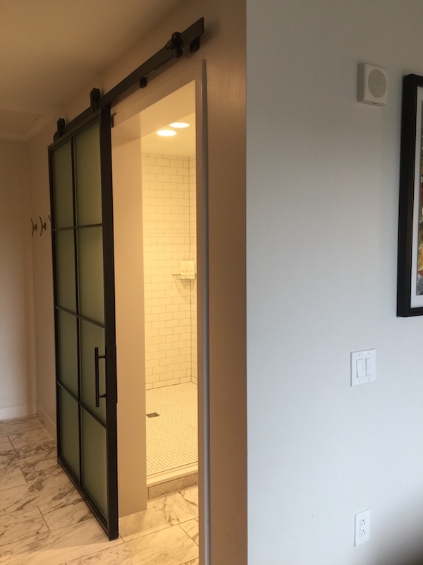 The bathroom was enclosed by a barn-style door.