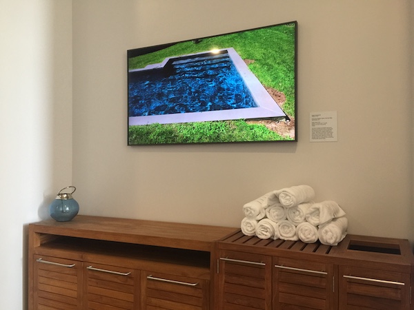 The pool also has bathrooms and various stations with beach towels for guests.