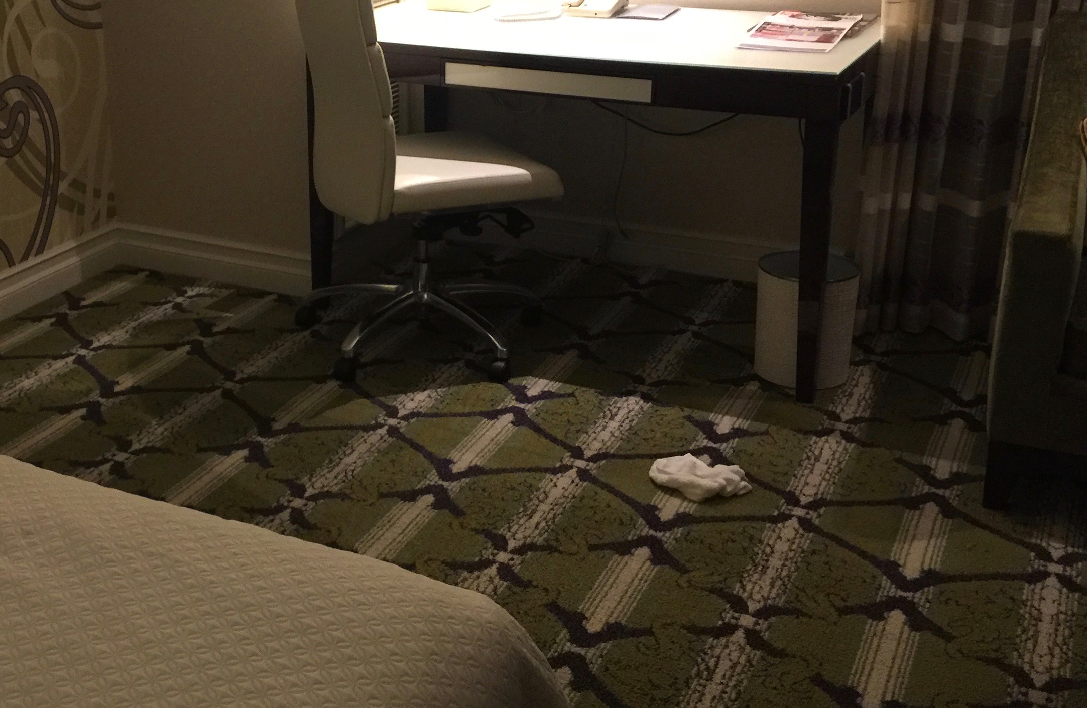 I was hoping to, at least, have a room facing the Bellagio Fountains but we were directed to Room 16632 in a remote tower. Upon entering the room, we immediately encountered peanuts scattered on the floor, a dirty wash cloth on the vanity below the television, and another dirty wash cloth, literally, in the middle of the bedroom floor.