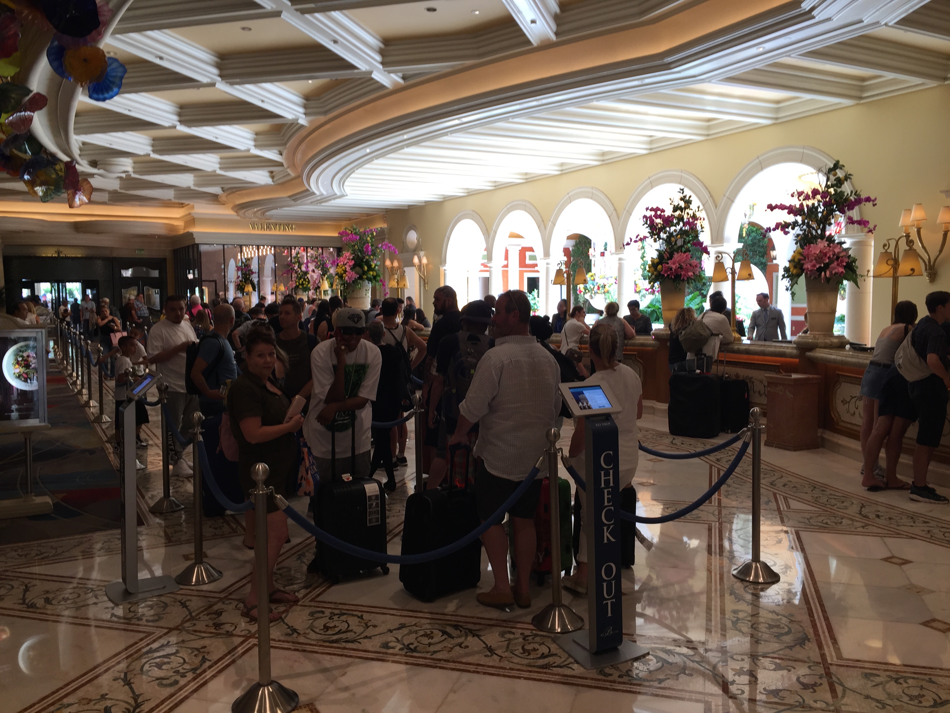 The Las Vegas strip is interesting because you can book most of the hotels (e.g. Aria, Bellagio, MGM, etc.) through major hotel sites like Hyatt or Marriott. I have status with both hotel chains but I’ve been so busy with other travel plans that I completely forgot to “status match” to the M Life – the loyalty program of MGM properties. I was reminded of my failure when I arrived in the lobby of the Bellagio and saw two options for check-in…a “priority line” with 1 person checking in and this zoo for other guests…