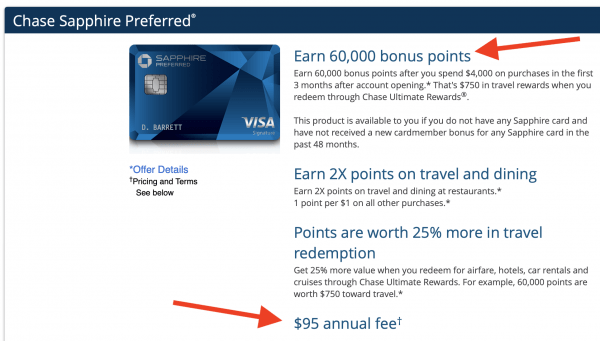 At the moment, CSP has a sign-up bonus of 60,000 Ultimate Rewards Points after spending $4,000 within three months (of approval of the card). In other words, if you are able to put $1,334 per month on this card for the first 3 months, you will be rewarded with 60,000 points.