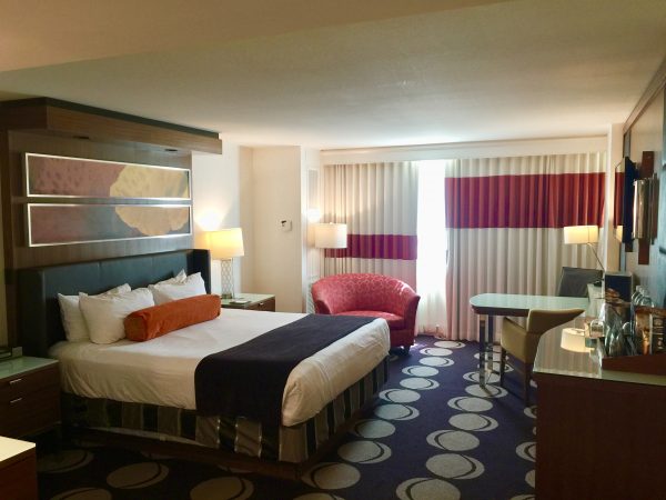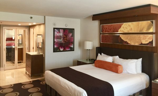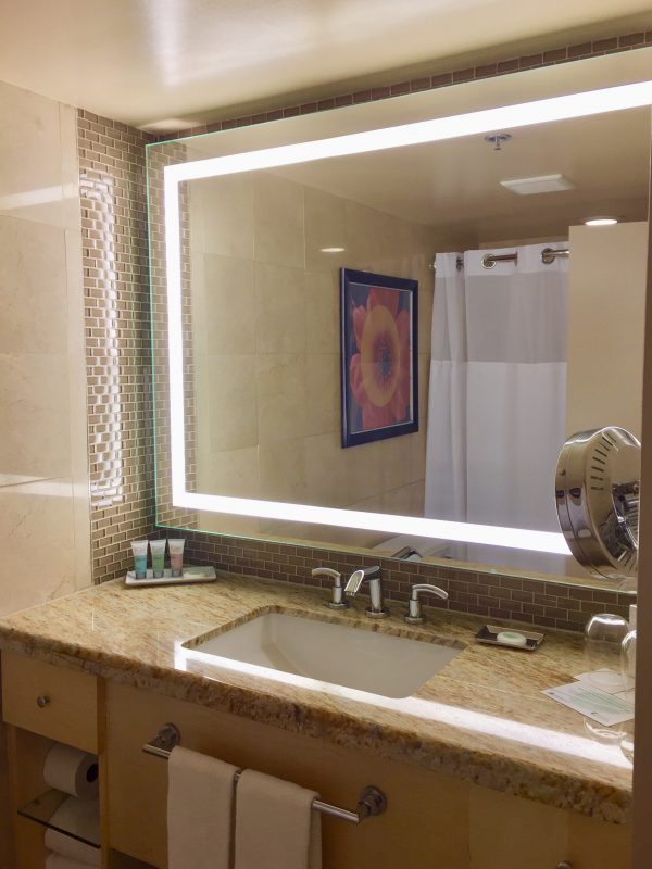 The room was simply decorated with floral accent pillows and art. The bed had individual, overhead lighting, plush down pillows and was extremely comfortable. Another impressive aspect about the room was the amount of cabinets / storage space. Although, I always pack everything in a carry-on regardless to the length of my trip, this is a feature I would appreciate if I had more of an extended stay in Las Vegas.