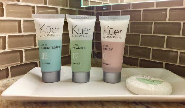 The bathroom was stocked with Kuer products – a line by MGM resorts. I find it amazing that the “Sea Splash” skincare products did, in fact, smell like the sea. It smelled good but I’m not sure if I, personally, would enjoy smelling like the sea.