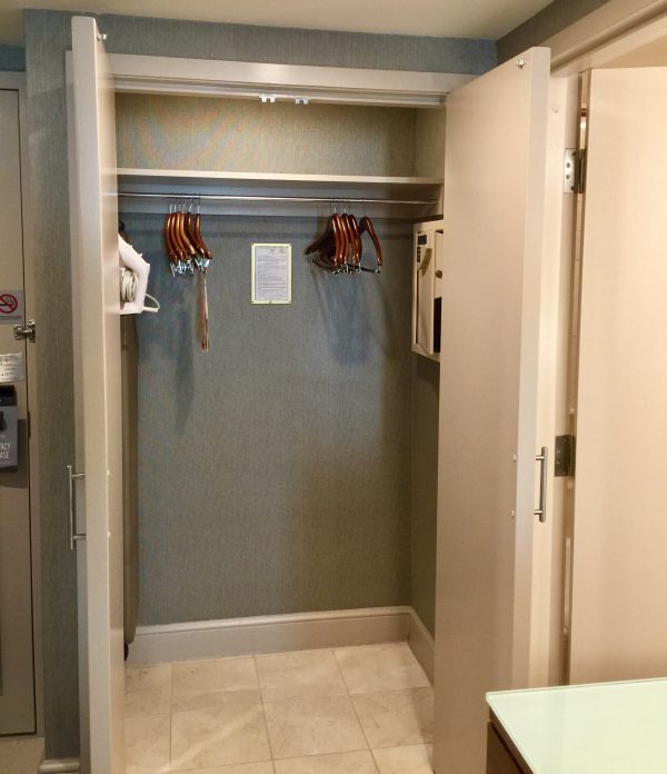 Returning to the entryway of the room, there was a closet that included your standard iron, ironing board, and deposit box.