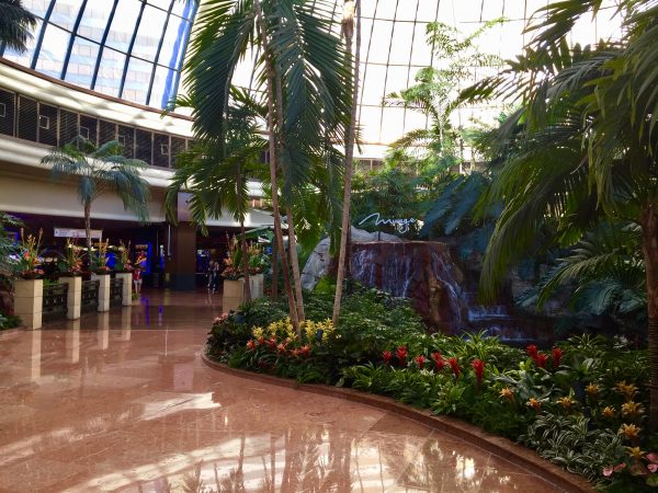 A large number of palm trees, water features, and other rainforest flora greet you in the atrium of the hotel entrance reinforcing the Polynesian theme.