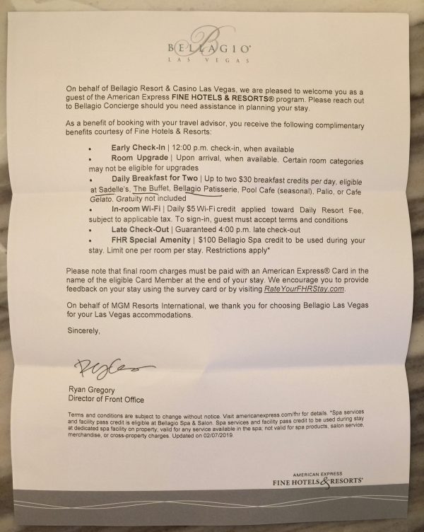 Fast Forward…I used FHR to book our one-night stay at the Bellagio in Las Vegas. When I checked in at the Bellagio hotel, I was thanked for booking through the FHR program and presented with this…