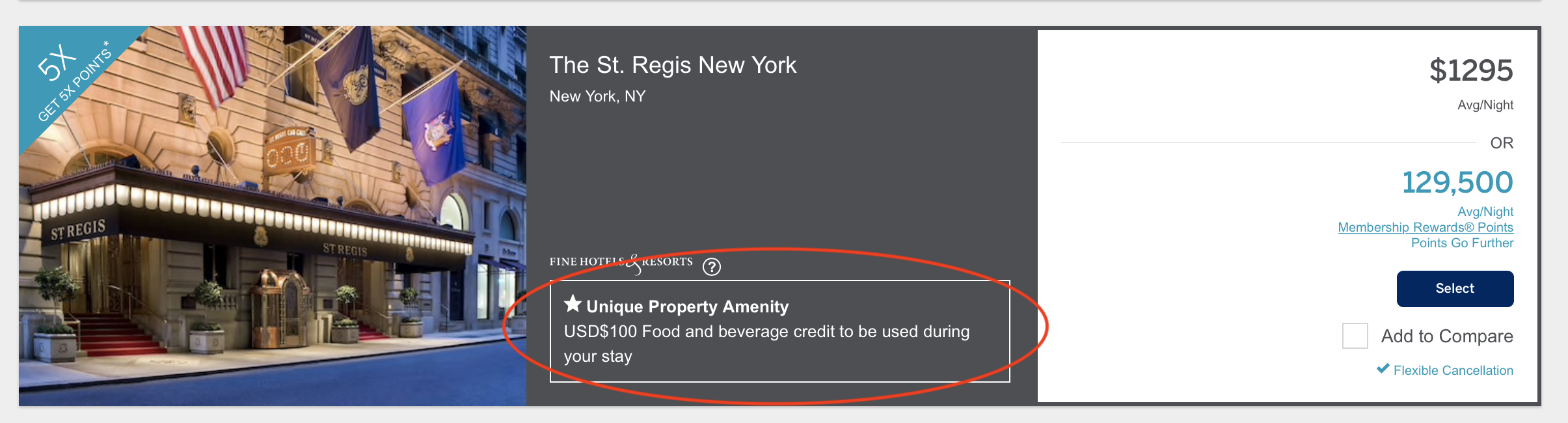 If you book any hotel through Amex FHR, that last bullet point will say “$100 Food and Beverage Credit” such as the St. Regis (New York City):