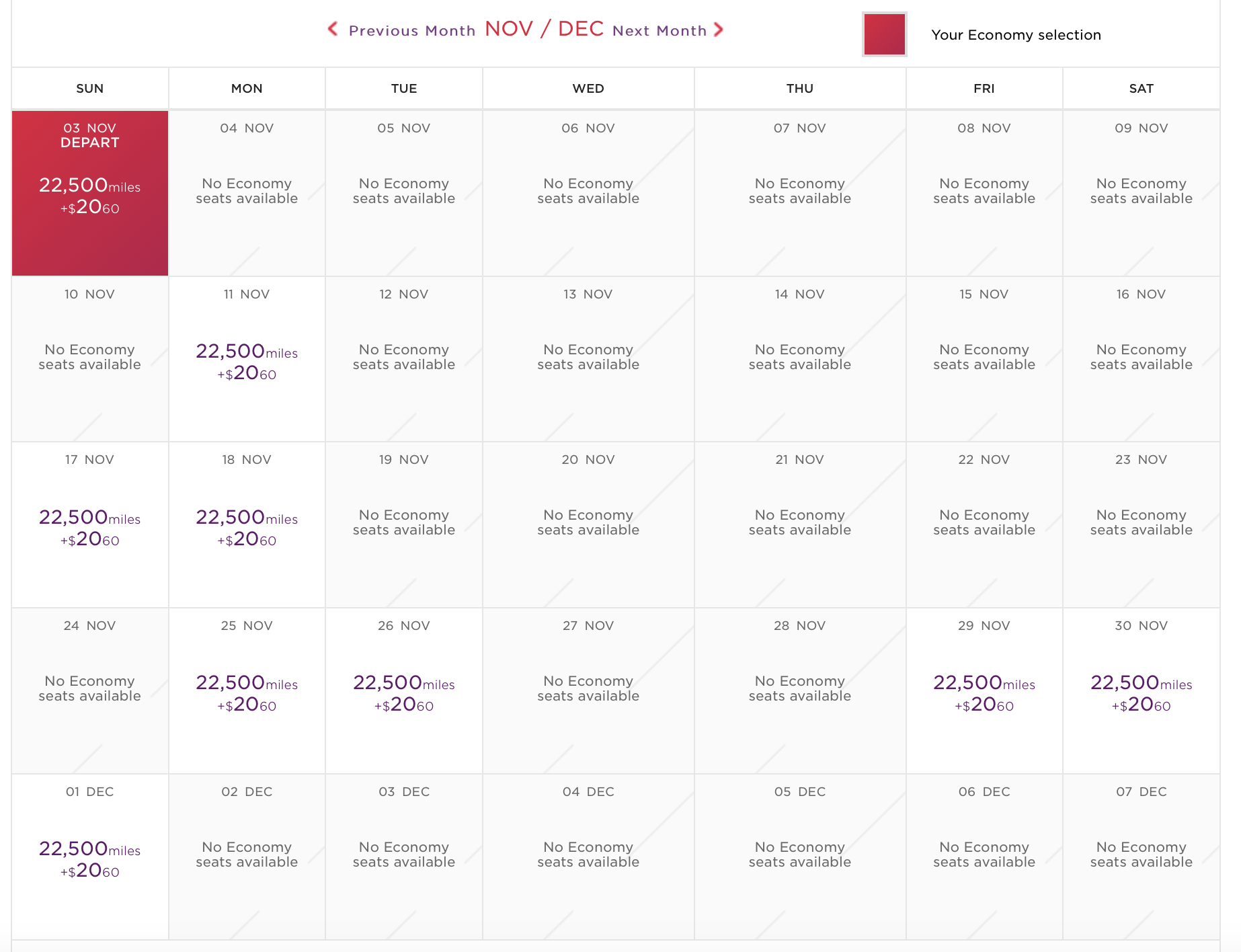 And the November 22nd return flight is also available (below). When performing an award search on Virgin, I prefer to see the entire calendar view and search one-way tickets. When you searching for a round-trip ticket, the “available dates” become a bit more convoluted.