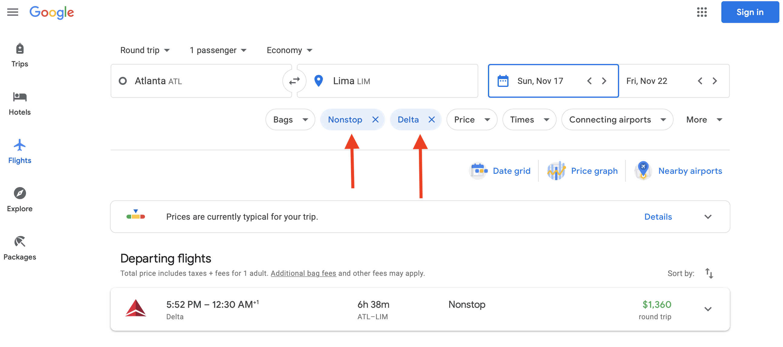 For the sake of this example, let’s say that vacation time is limited, she wants to go Nov 17 – 22, and she wants to be on the non-stop Delta flight. Generally, the more flexible you are, the better. However, let’s see what happens. I select her prerequisites and, as expected, Delta is charging a premium.