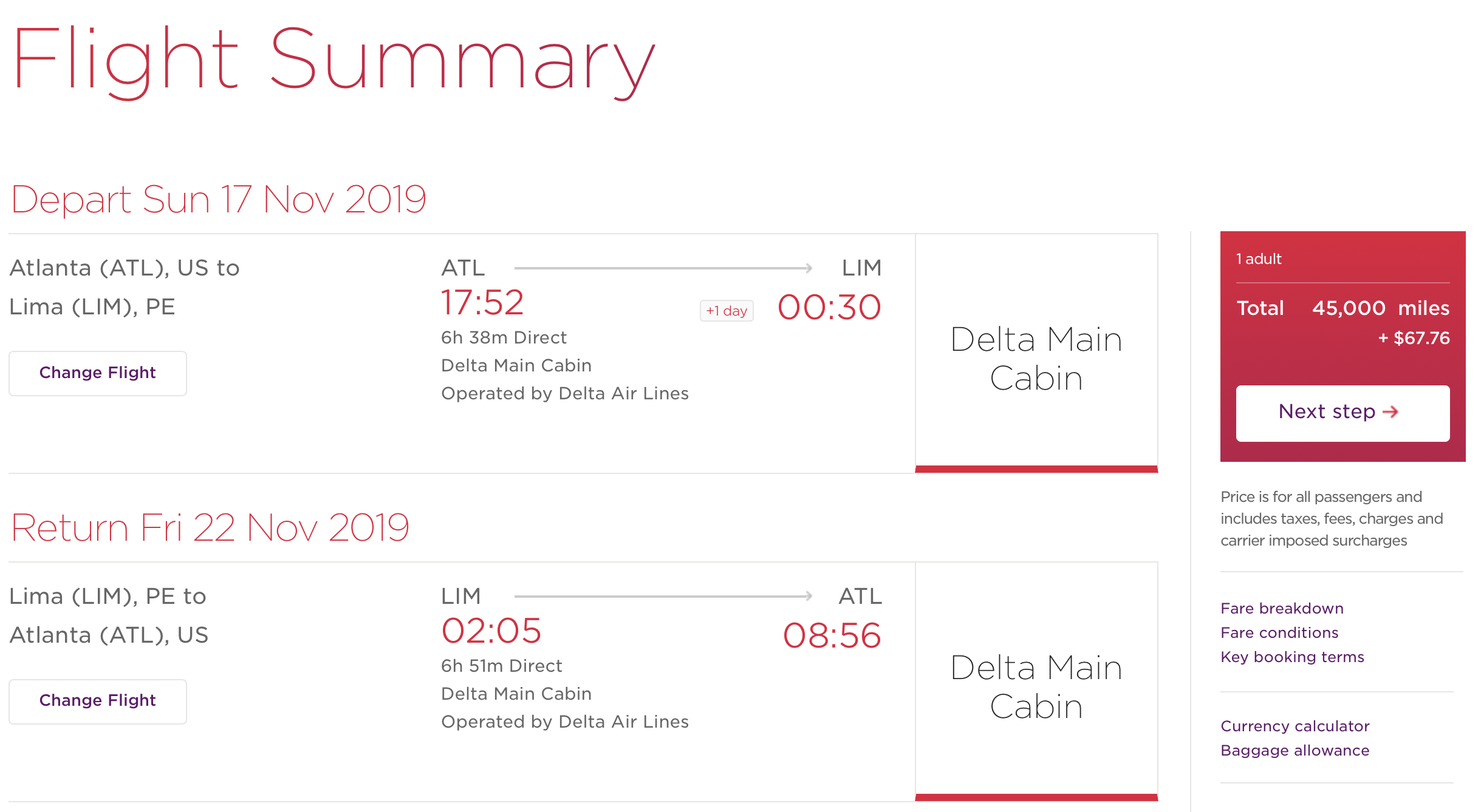 As you can see below, the round-trip flight will cost 45,000 miles and $67.76. It is worth mentioning a few small details. First, although you booked through Virgin, you will be flying on Delta planes. In the photo below, it says “operated by Delta Airlines.” Also take note of the flight times…they are the same flights as we saw on the Delta website.