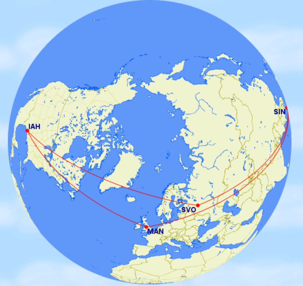 Anyway, in the early 2000’s, Singapore Airlines used one plane to fly from Houston to Moscow and then continue on to Singapore. However, in 2016, they amended that route and substituted Moscow with Manchester thus giving us today’s route of Houston-Manchester-Singapore (IAH-MAN-SIN). They also began flying a newer plane (the Airbus A350) on that route.
