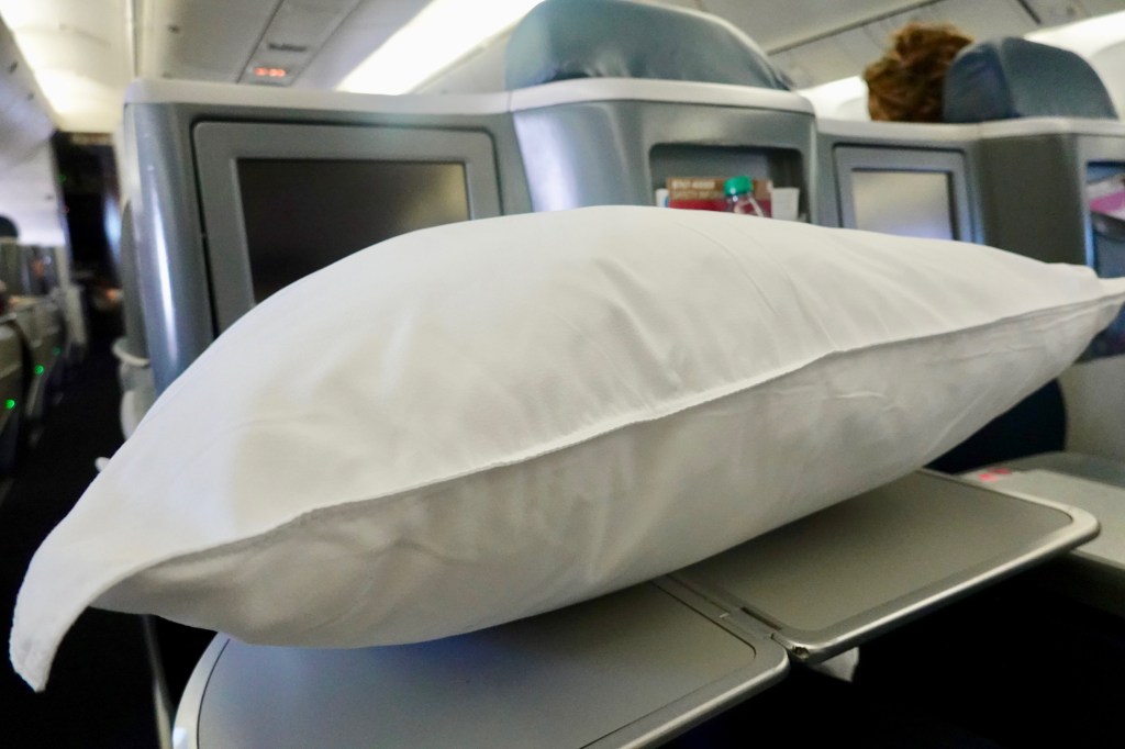 At our seat we found a Tumi Amenity Kit, a bottle of water, and soft Heavenly bedding (pillow and duvet).