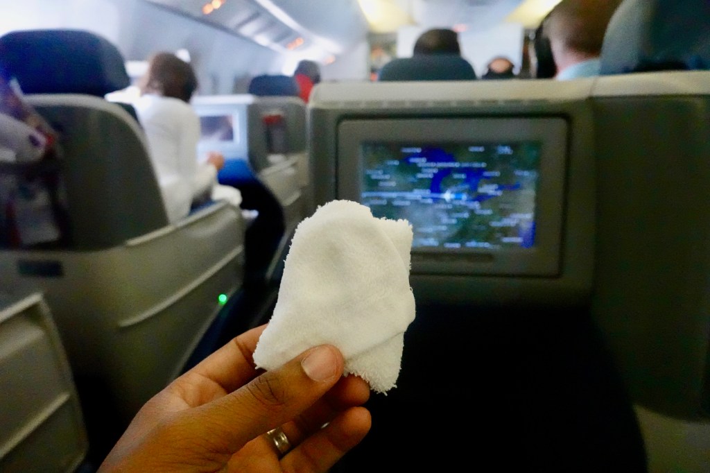 Just under an hour after takeoff the crew distributed warm (but small) towels.