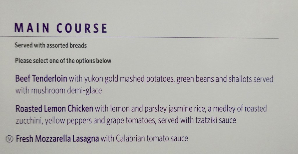Before we pushed back, the flight attendant took our order and menu read as such: