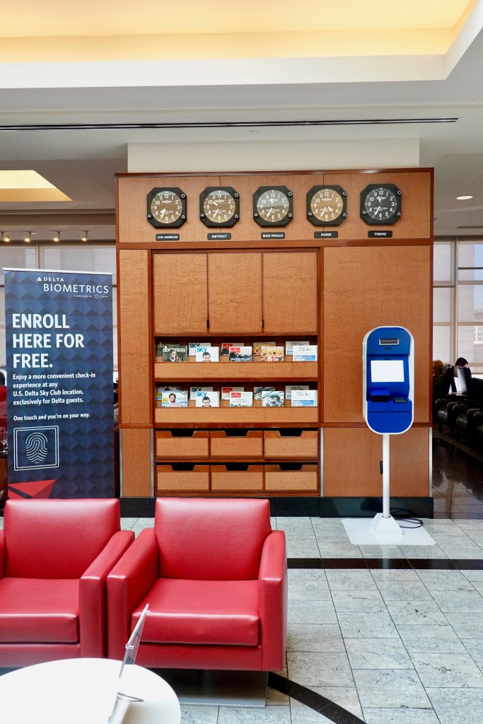 As we entered the lounge (on the 2nd floor) from the escalator, there was an agent that was registering individuals for “Clear.” If you are unfamiliar with Clear, it is a program that uses biometrics (e.g. your eyes and finger prints) to confirm your identity instead of using traditional ID documents. We weren’t interested so we continued into the lounge.