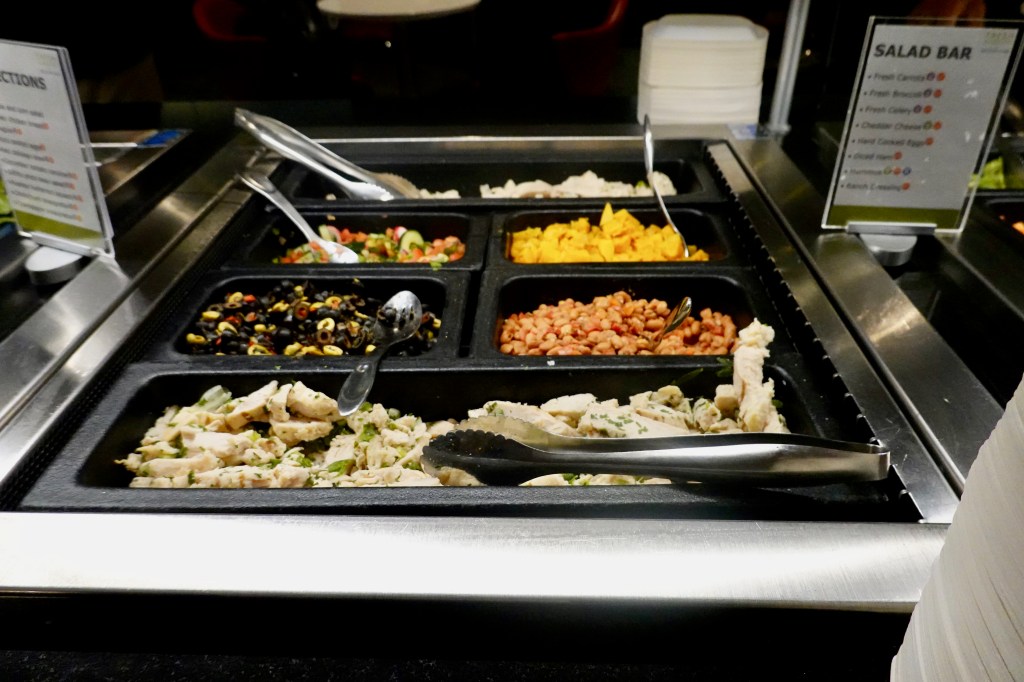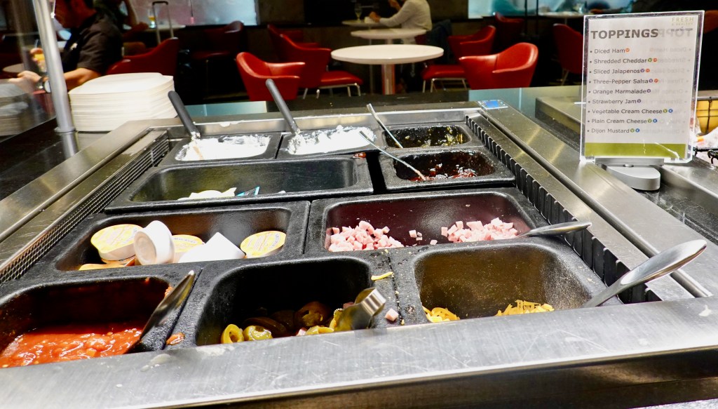At this point (10:30 am), we decided to visit the buffet. It was a breakfast selection that included assorted pastries, fruit (melon and pineapple, bananas, oranges and apples), scrambled eggs and toppings, hard-boiled eggs, cereal, bagels, muffins, and oatmeal. They also had specialty “Sky Bowl Bases” such as Quinoa Sweet Potato Hash with Spinach and Scrambled Eggs with Herbs.