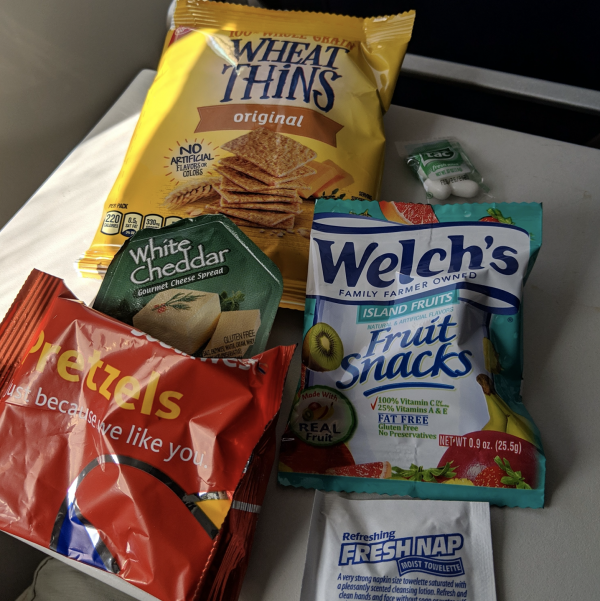 For example, their “snack pack” includes: wheat thins, spreadable cheese, fruit snacks, pretzels, and tic tacs for the first service and then a package with 2 Milano cookies for a second snack service before landing.