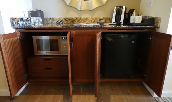 Near the entrance there was a wooden cabinet that housed a microwave and large refrigerator. There was also a Keurig and hot water kettle.