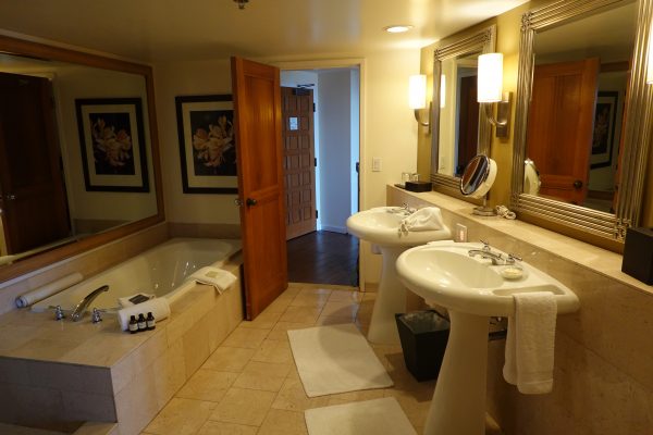 Transiting through the bedroom and into the bathroom, we found a large soak tub, double sink vanities, a convex vanity mirror, and a basket for used towels.