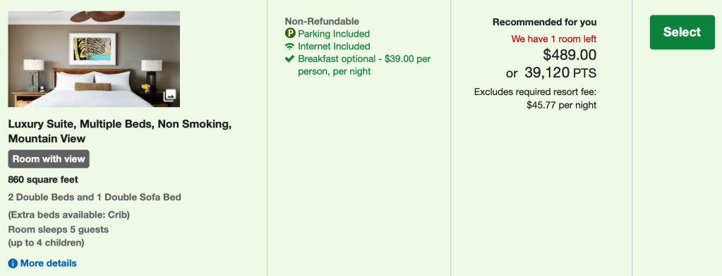 As you can see, the cheapest room is $489 or 39,120 points per night (at 1.25 cents per points using CSP or 32,600 points with CSR). We were staying 3 nights so we redeemed 97,800 Chase Ultimate Reward points.