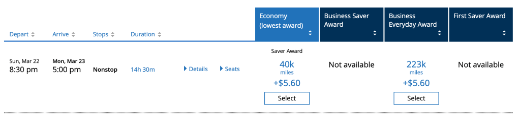 Now that United’s flight to Cape Town are bookable, the bad news is that award seats are priced extremely high. ‘Economy Saver’ award tickets appear to be available at 40k miles, however, ‘Business Saver’ is non-existent. Business Everyday is plentiful but also pricing at 223k miles. Hopefully, that changes soon.