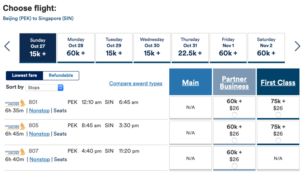 One sweet spot was found in the intra-Asia chart. Here is the example that I mentioned…the ability to fly from Beijing (PEK) to Singapore (SIN) – 6 hours – in Singapore 1st Class Suites for 35,000 miles: