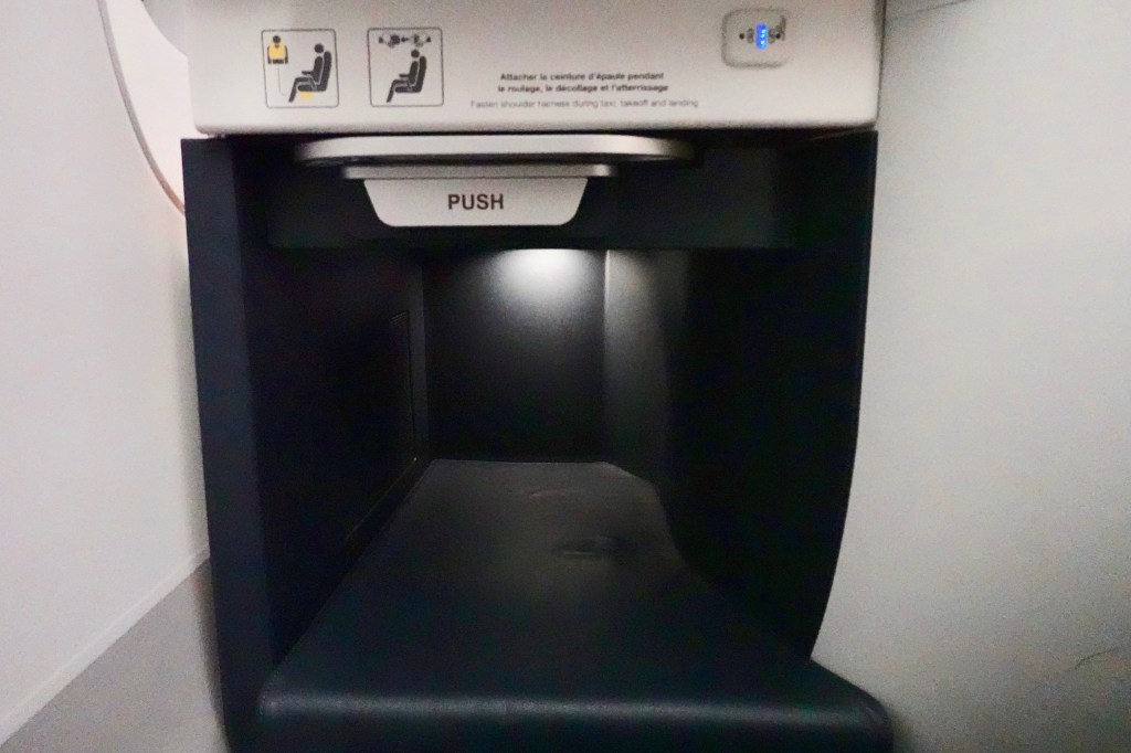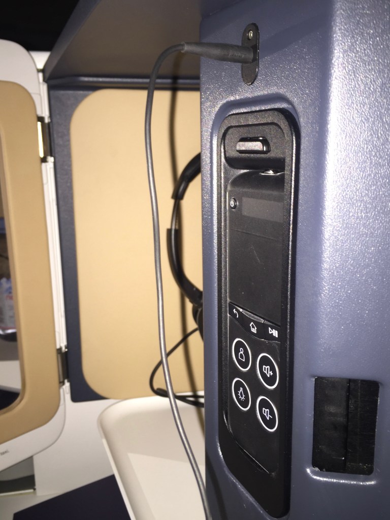 There was a storage compartment (above the console) with a mirror, bottle of water, and a pair of noise cancelling headphones. On the side of the storage compartment, you will also notice the entertainment controller for the TV.
