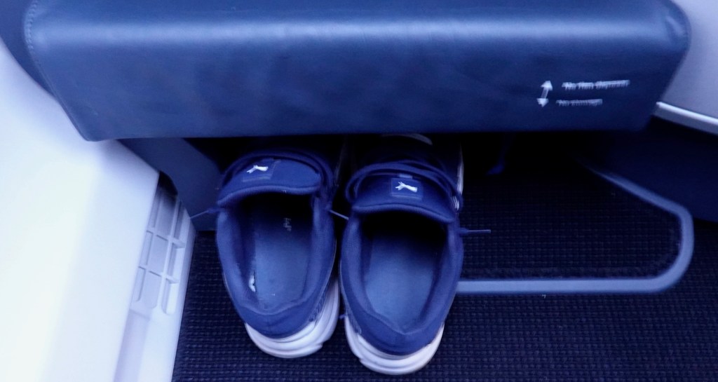 Also waiting at my seat were a pair of slippers, a shoe bag, and ear phone covers.
