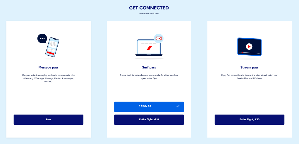 - Surf pass, which is basic internet that costs 8EUR for an hour or 18EUR for the entire flight