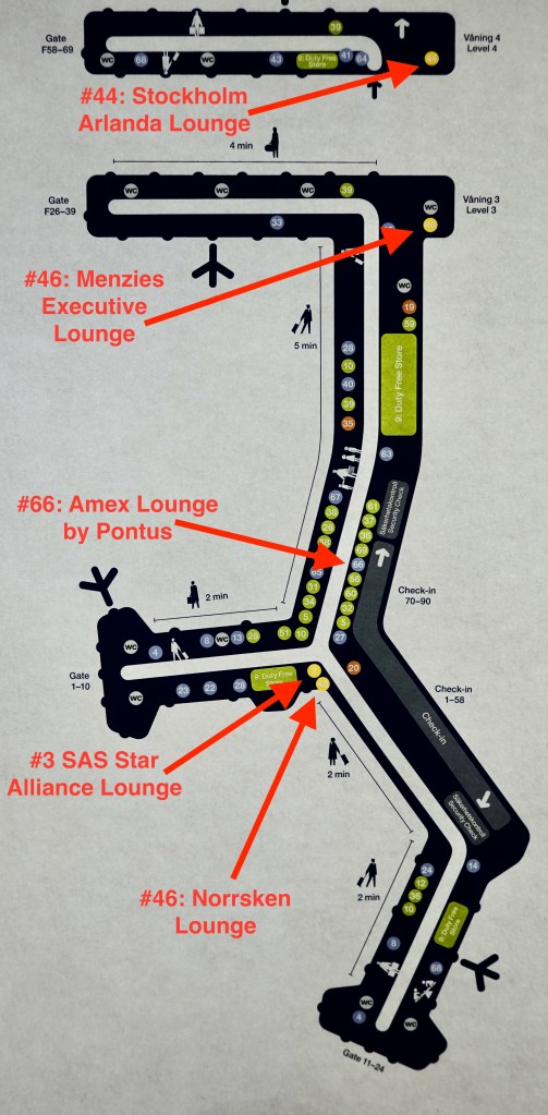 The lounge is located in the Terminal 5 of Arlanda Airport. The terminal has a few wings and the lounge is located near Gate 1. I will reference this map (below) for all the lounge reviews at Stockholm Airport.
