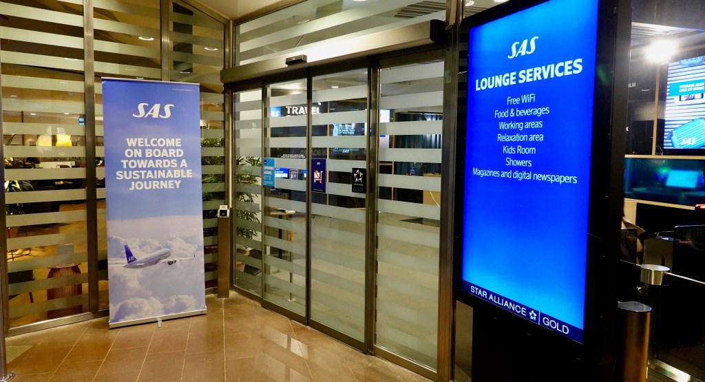 Once you ascend the stairs (or elevator) and arrive on the floor above the concourse, you will see the Scandinavian Airlines (SAS) Lounge to your left…