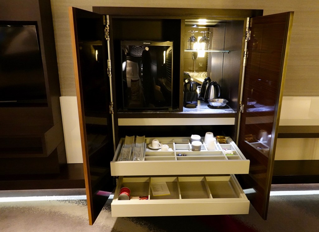 On the other side of the flatscreen TV, there was a beautiful cabinet with a mini fridge, in-room coffee machine and a variety of tea. For all the Brits out there, yes, there is evaporated milk for your tea!