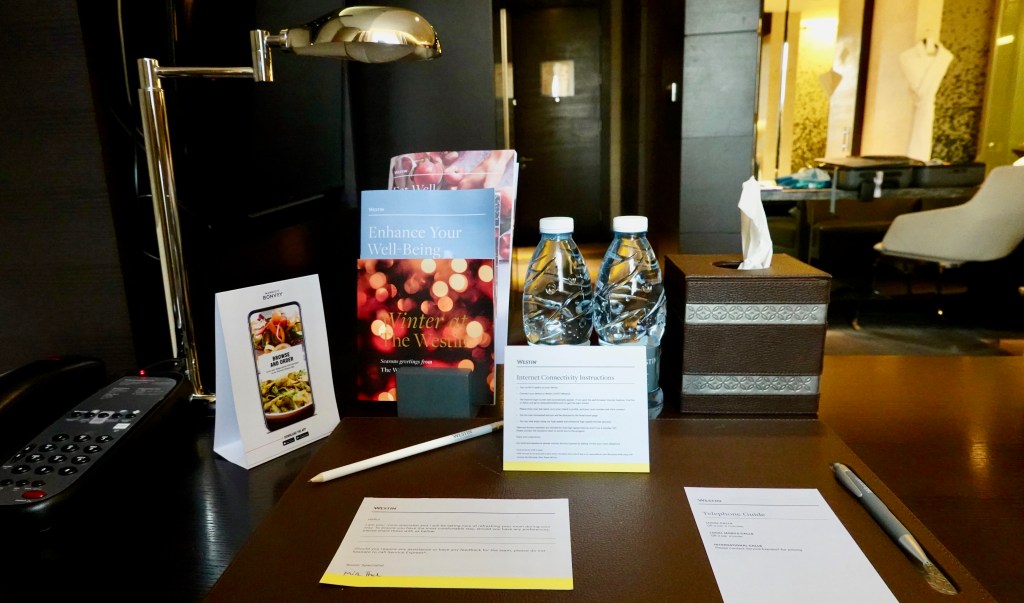 In the far corner of the room was a desk with bottled water, tissues, and information about the hotel restaurants and spa.