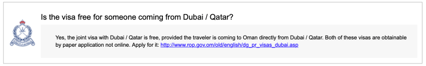 NOTE: Once I arrived at my hotel, I did some further investigation to confirm my thoughts about the visa and it turns out that there is competing information. Per the Royal Omani Police FAQ page, the visa is free but you have to apply.