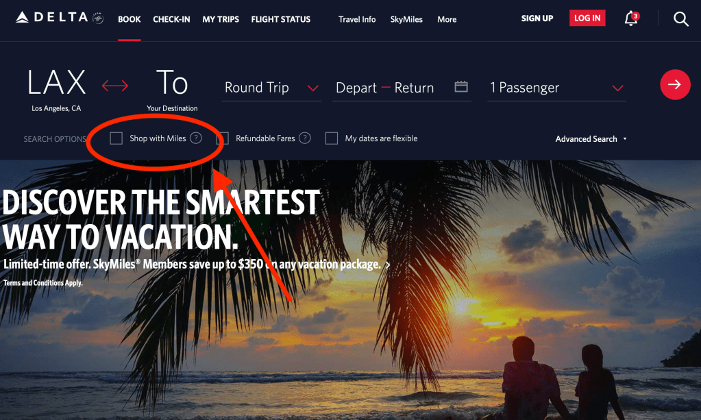 Most people are familiar with the “BIG US3” – Delta Air Lines, United Airlines, and American Airlines. All of their homepages look different but located somewhere on their page is a box that says “miles.” You will need to select this box to redeem your points/miles. For example…