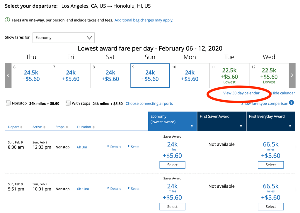Let’s say you want to fly to Hawaii – specifically Los Angeles (LAX) to Honolulu (HNL), one-way in economy on February 9th. Head to the website of your choice, search for flights as if you were paying with cash. However, make sure you select the “Redeem miles” box on the search screen. This process will be similar with frequent flyer programs throughout the world.
