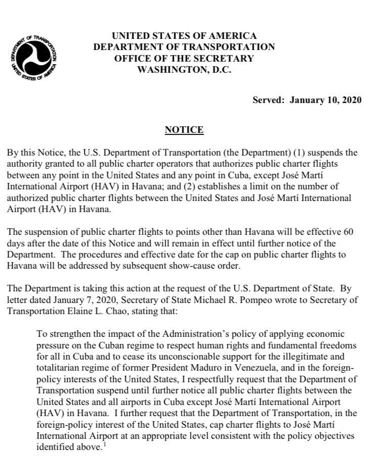 Last week, the Department of State asked the White House to prohibit charter flights from the United States to nine Cuban provincial airports starting 10 March 2020. Only flights to Havana would still be allowed. Additionally, the Department of Transportation would also put a limit on the total number of annual flights to the Cuban capital.