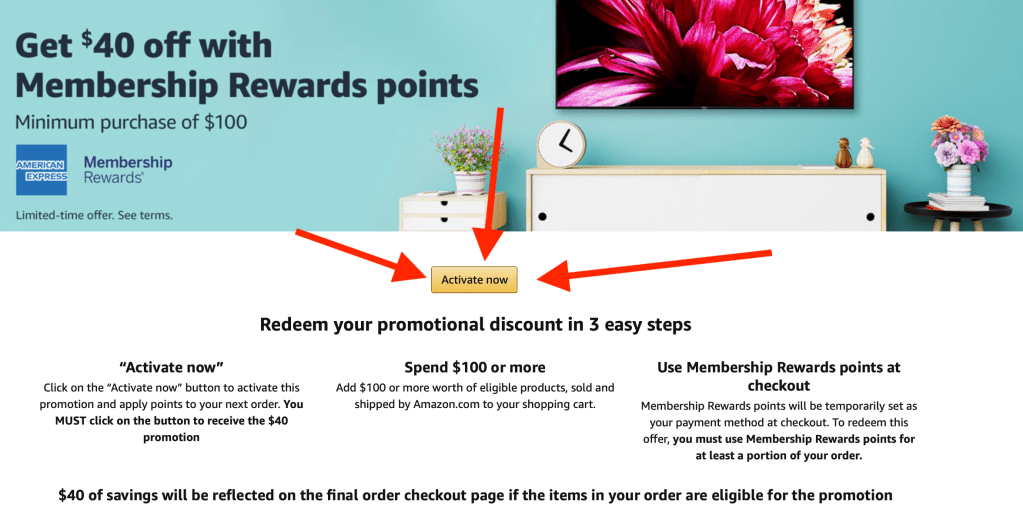 There should be a banner at the top of the next page that says “Get 40% your eligible purchase of $100 or more when you use Membership Rewards points from American Express.”