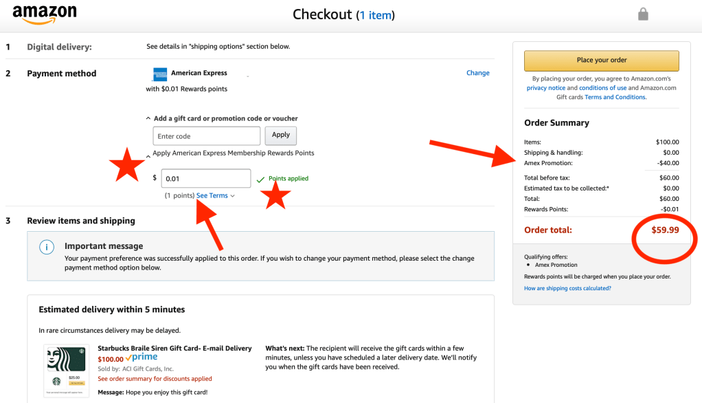 CAVEAT: The amount of points required to cover the entire purchase will be displayed in the ‘points applied’ box. Be sure you change it to .01 (aka 1 point). If you don’t, you’ll be exchanging a lot of points to cover the purchase and that’s a bad deal.