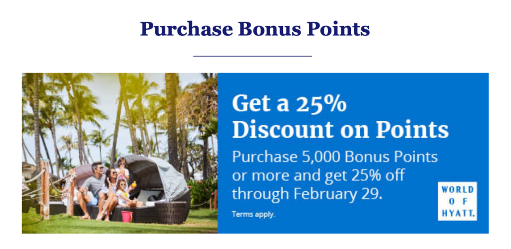 At the moment, World of Hyatt is offering a 25% discount when you purchase at least 5,000 points or more in one transaction through 29 February 2020.