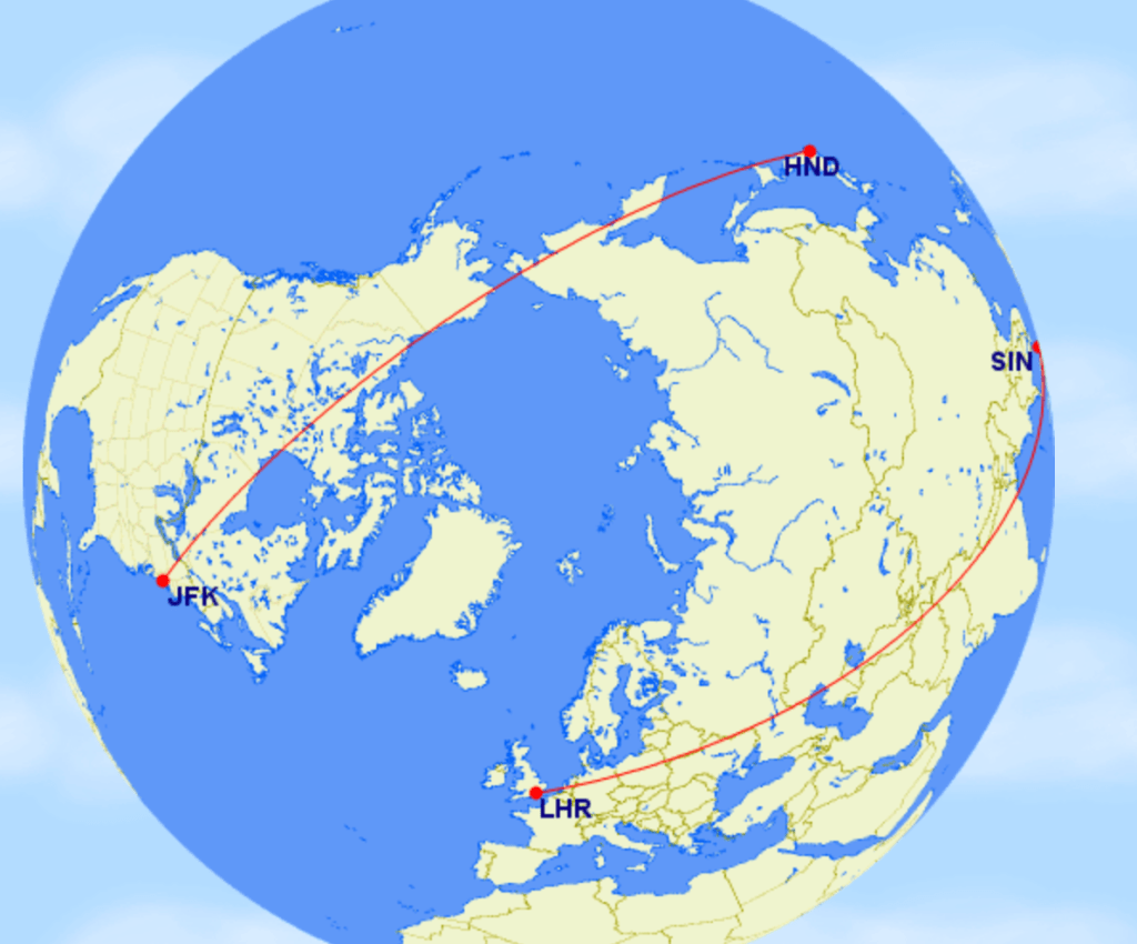 London (LHR) – Singapore (SIN) – Hong Kong (HKG) – Sydney (SYD) – Bangkok (BKK) – Taipei (TPE) – Tokyo (HND) – New York (JFK)