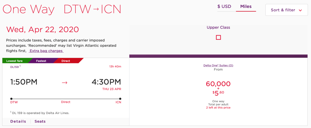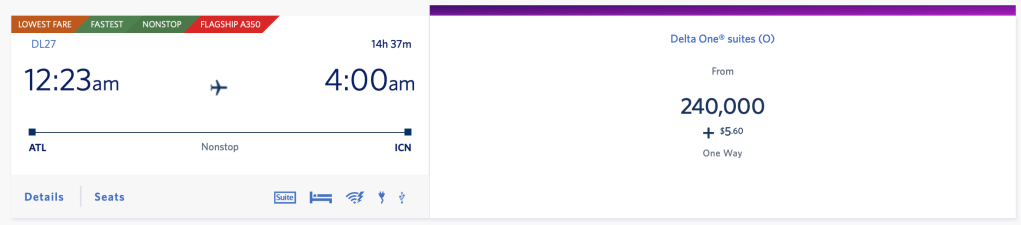 In the recent past, finding award availability and booking through Virgin has been a chore, particularly, if you wanted to fly Delta One to Seoul-Incheon (ICN) because Virgin Atlantic’s website didn’t even list ICN as an option. This meant you had to call Virgin to find availability and although the Virgin call enter is (arguably) one of the best out there, it was still inconvenient.