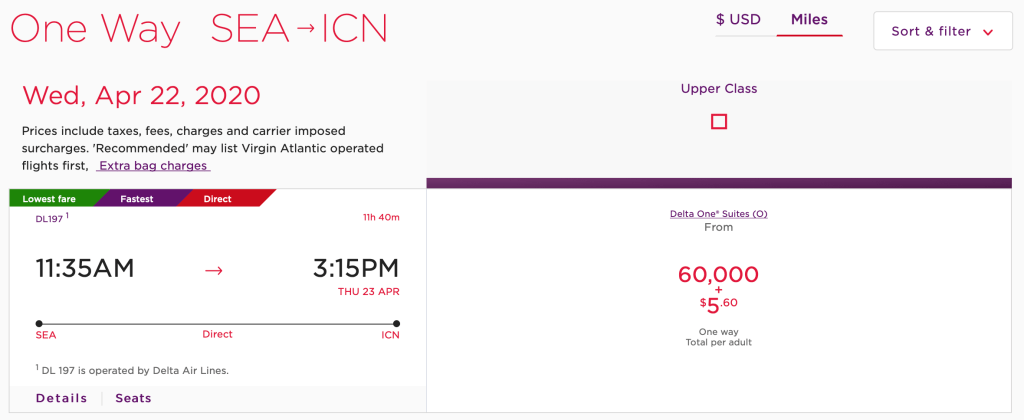 Anyway, Seoul-Incheon (ICN) can now be found on Virgin Atlantics website which means you can now search for availability and book Delta One flights to Seoul directly at VirginAtlantic.com.