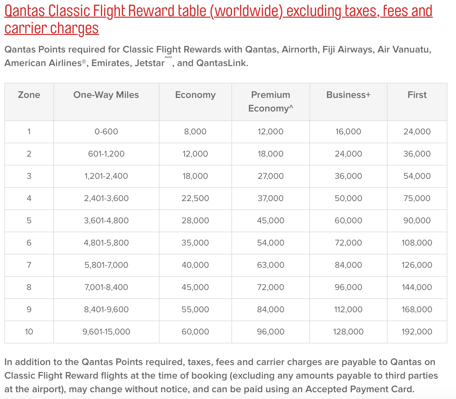 Let’s take a look at the Qantas award chart for travel on Qantas, Fiji, and American (in addition to a few others)…