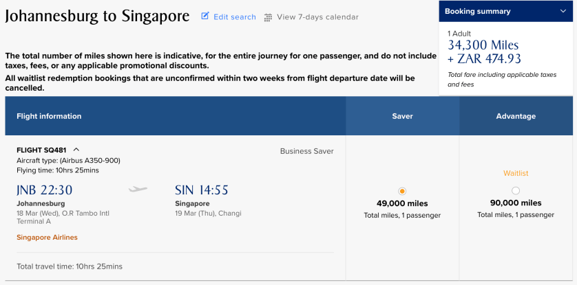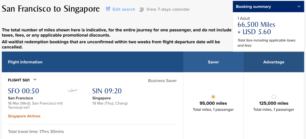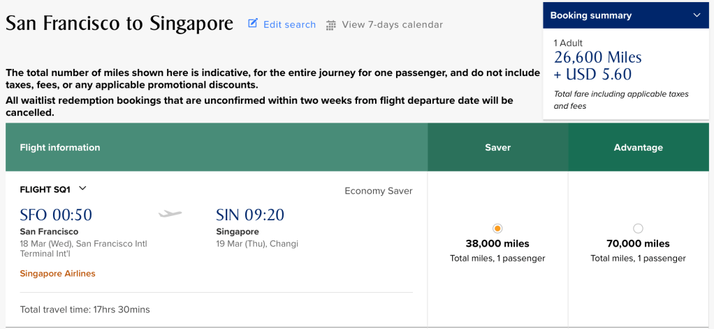 Note: The Singapore Airlines website doesn’t make it obvious that the discounted miles rate is being applied. Don’t worry, once you select the actual flight the discounted rate will then be shown in the upper right hand corner (provided your flight is applicable for the discount). For example, in the photo above, the “normal” rate was 38,000 miles but when I selected the flight, you can see it’s now 26,600 miles.