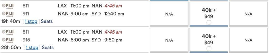 But this is where it gets good….Alaska allows one free stopover on award tickets, which means you can fly from the U.S. to Fiji, hang out as long as your want, and then continue on to Sydney for — you guessed it — 20,000 miles in economy or 40,000 in Business: