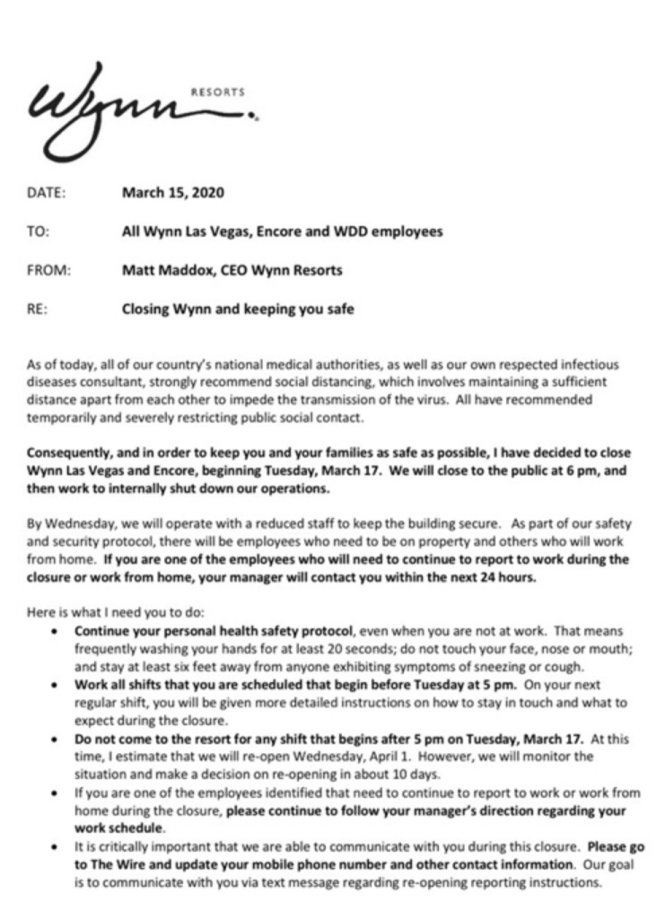 Later that day, Wynn CEO Matt Maddox sent a video assuring workers their jobs were safe as the industry experiences a downturn from the coronavirus pandemic.